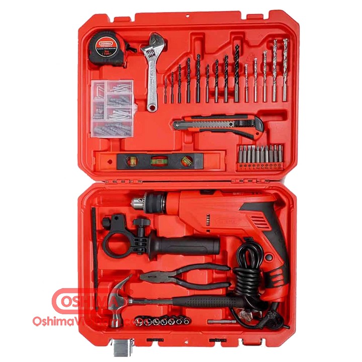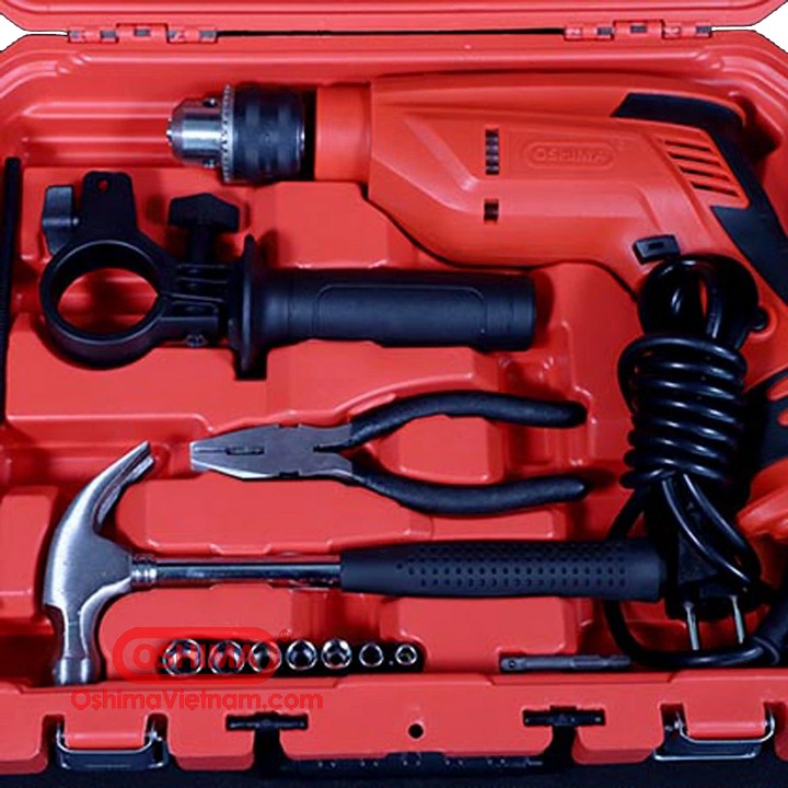 - Máy khoan Oshima đi kèm hộp đựng bằng nhựa PE-HD rất dày, đảm bảo cố định máy và phụ kiện trong hộp chắc chắn, thuận tiện cho việc sử dụng, di chuyển.