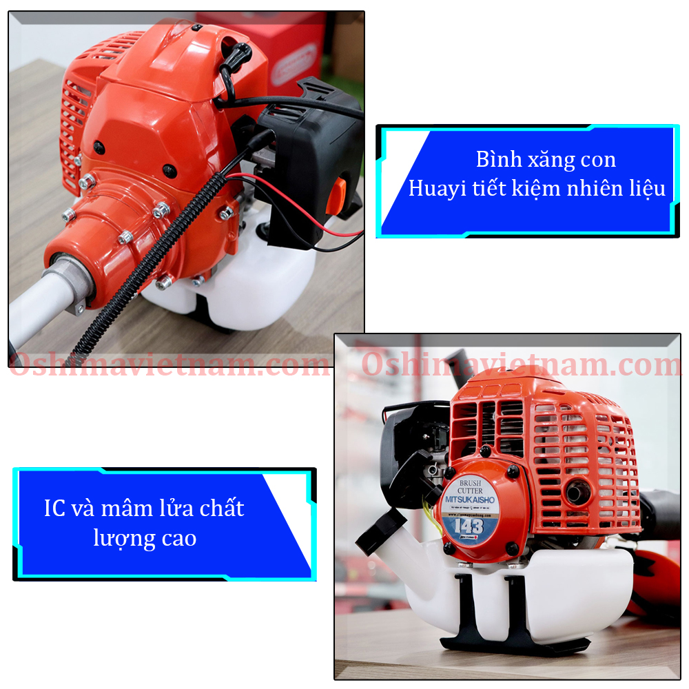 Máy cắt cỏ chính hãng Mitsukaisho 143 sử dụng bugi có chất lượng cao. Máy rất dễ khởi động, có tuổi thọ cao. Dây đeo của máy là loại dây đeo lớn, chắc chắn và có khóa nhanh. Vỏ của máy được làm từ nhựa nguyên chất. Máy được sơn lớp bóng bảo vệ.