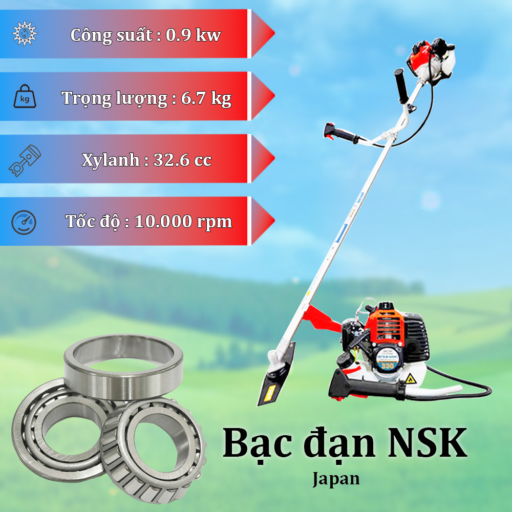 Đường kính xilanh máy lớn cho lực đẩy mạnh, tốc độ quay tới 10.000 vòng/phút cho khả năng cắt nhanh và đều hơn. Đầu bò, bắp chuối, chém máy lớn, dày và chắc chắn. Bình xăng có đế chắn bằng sắt giúp giảm thiểu hư hại cho máy khi tiếp xúc với đất. Tay dên và bạc đạn sản xuất theo công nghệ Nhật Bản. Trọng lượng của máy tương đối với người dùng cho ta di chuyển dễ dàng.