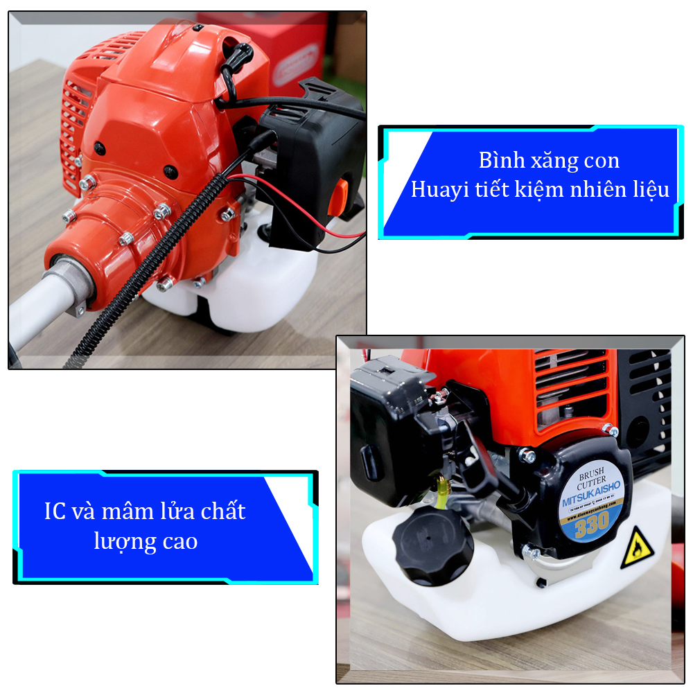 Máy cắt cỏ Mitsukaisho 330 2 thì chính hãng sử dụng bugi có chất lượng cao. Máy rất dễ khởi động, có tuổi thọ cao. Dây đeo của máy là loại dây đeo lớn, chắc chắn và có khóa nhanh. Vỏ của máy được làm từ nhựa nguyên chất. Máy được sơn lớp bóng bảo vệ.