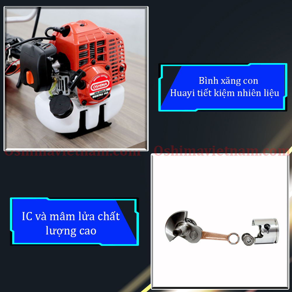 Máy cắt cỏ Oshima sử dụng động cơ 2 thì làm mát bằng gió cho công suất mạnh mẽ. Bình xăng của máy sử đụng là bình xăng hiệu RUIXING có chất lượng tốt của Nhật, giúp máy tiết kiệm nhiên liệu tới 30% giảm thiểu chi phí sử dụng. Bình xăng nhựa dày, cổ bình xăng cao giúp ích cho việc sửa chữa, dốc máy không lo sợ xăng chảy ra ngoài, dung tích bình xăng lớn. Nhiên liệu của máy là xăng pha nhớt theo tỷ lệ 25:1, tiết kiệm đáng kể lượng nhiên liệu cho người dùng.