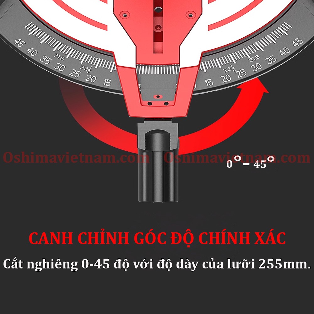 Nguồn điện áp đầu vào 220V/50hz tiện lợi với mọi khu vực. Máy cắt Oshima có khả năng cắt nhiều góc độ khác nhau, có khả năng cắt nghiêng 0-45 độ với độ dày của lưỡi 255mm.