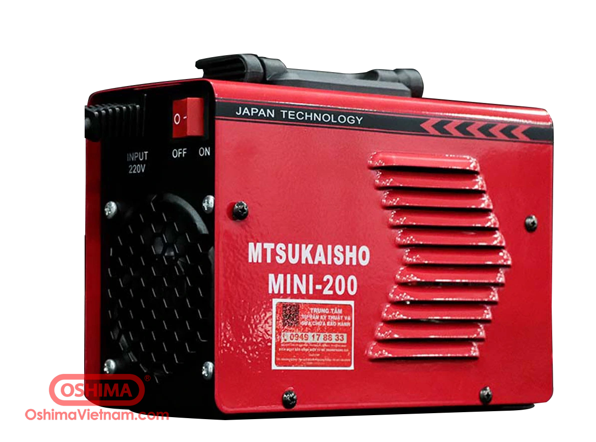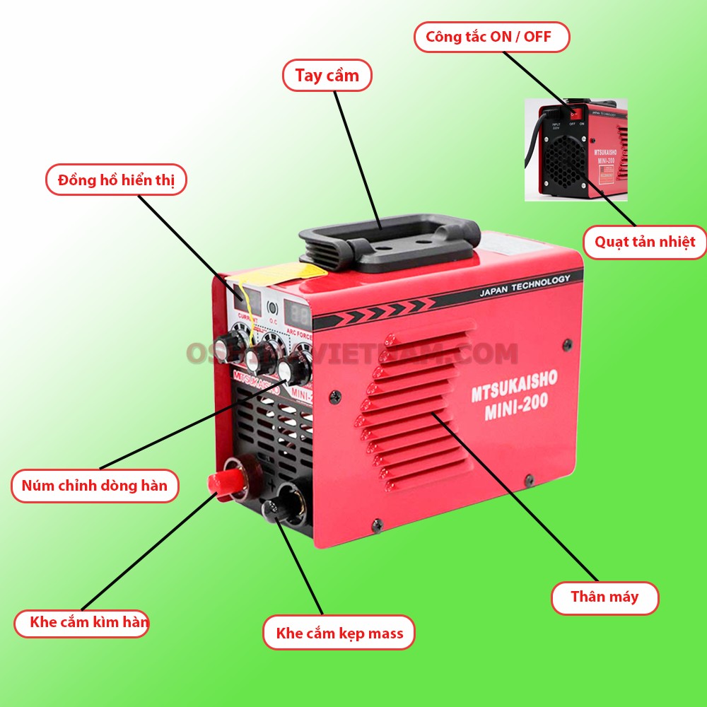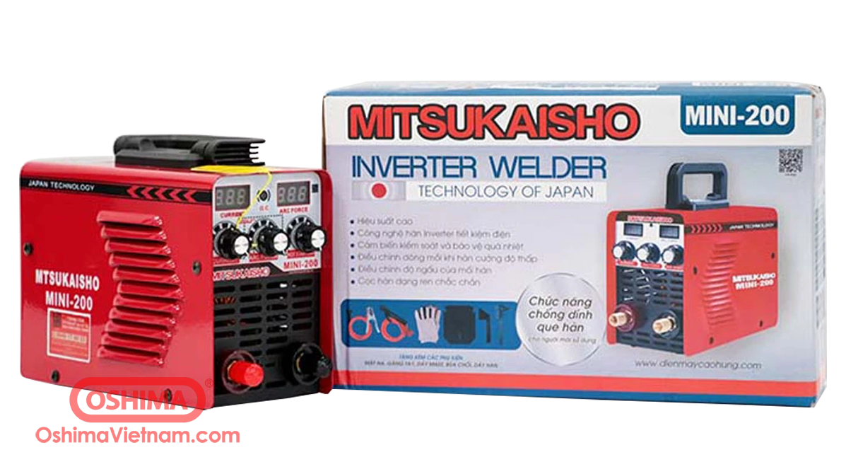 - Mitsukaisho MINI 200 có dòng hàn mạnh mẽ, có thể hàn được nhiều kích cỡ que, có chức năng chống dính que hàn cho người mới tập hàn và chức năng chỉnh độ sâu mối hàn.