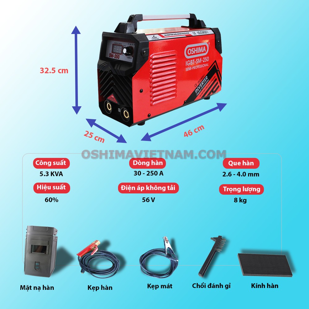 Thông số kỹ thuật và phụ kiện đi kèm của máy hàn Oshima IGBT SM 250