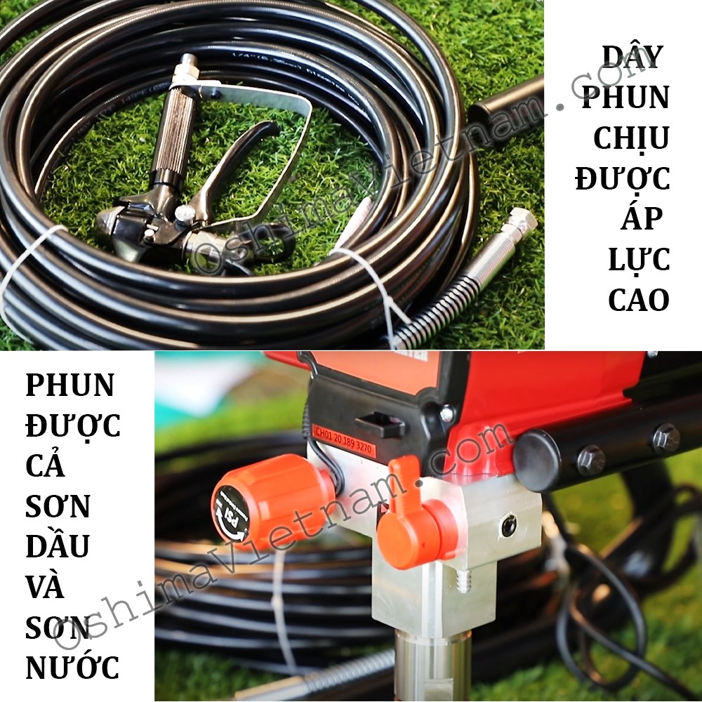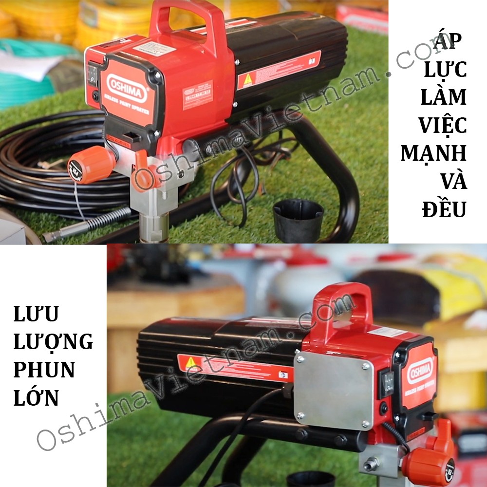 - Máy phun sơn OSHIMA có khả năng sơn được cả sơn nước và sơn dầu nhờ có phốt áp lực cao bằng PU