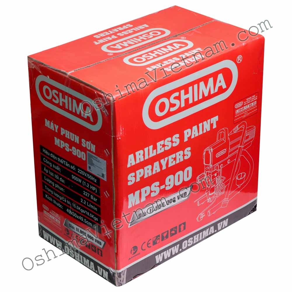 - Thương hiệu OSHIMA có dòng sản phẩm máy phun sơn MPS - 900 với công suất 900W, máy được sản xuất trên dây truyền hiện đại, công nghệ cao, có thiết kế gọn nhẹ, sử dụng vô cùng đơn giản, lắp ráp dễ dàng nhanh chóng